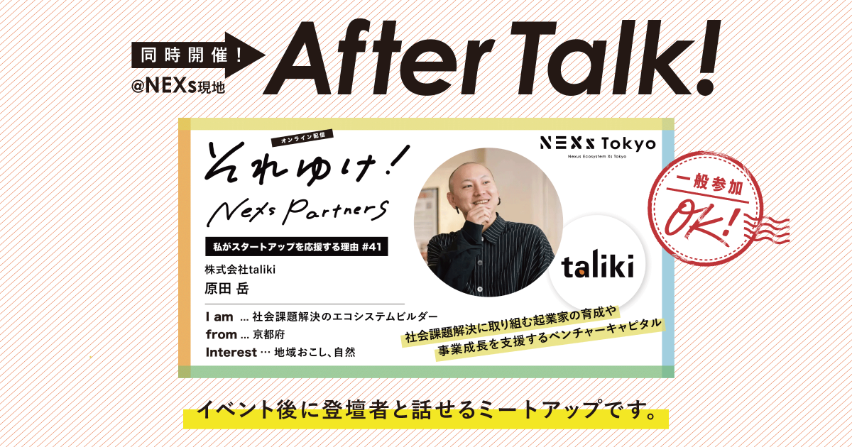 地方自治体・ベンチャーキャピタル・大企業などのNEXs Tokyo パートナー会員をゲストとしてお招きし、スタートアップのための支援事業や取り組み、そして、スタートアップを応援する理由をインタビューする番組「それゆけ!NEXs Partners 」と連動した、ミートアップイベント!登壇者をゲストに招くイベント番外編です。
